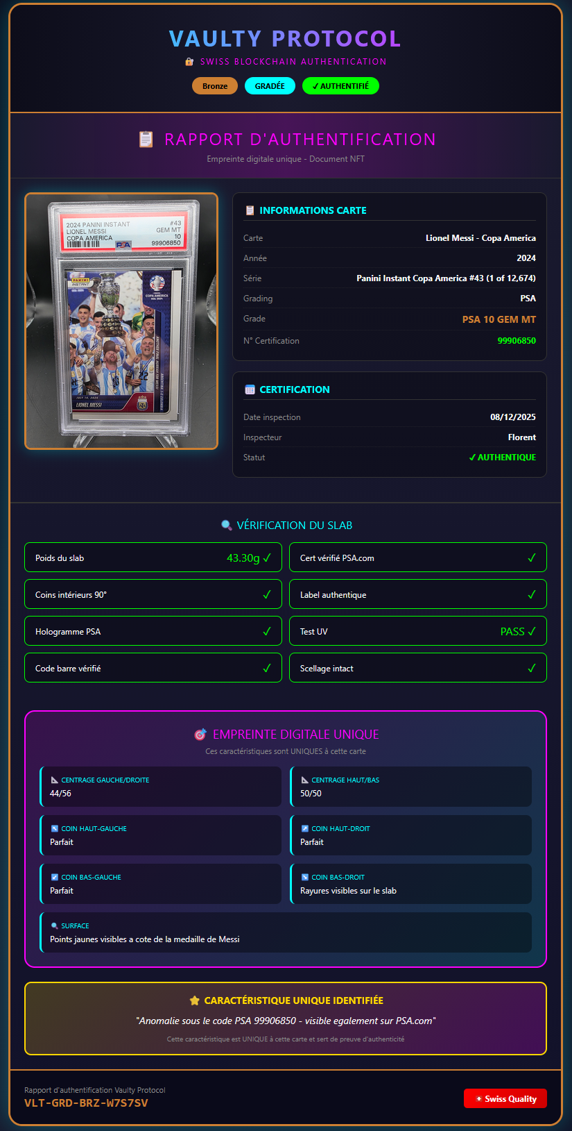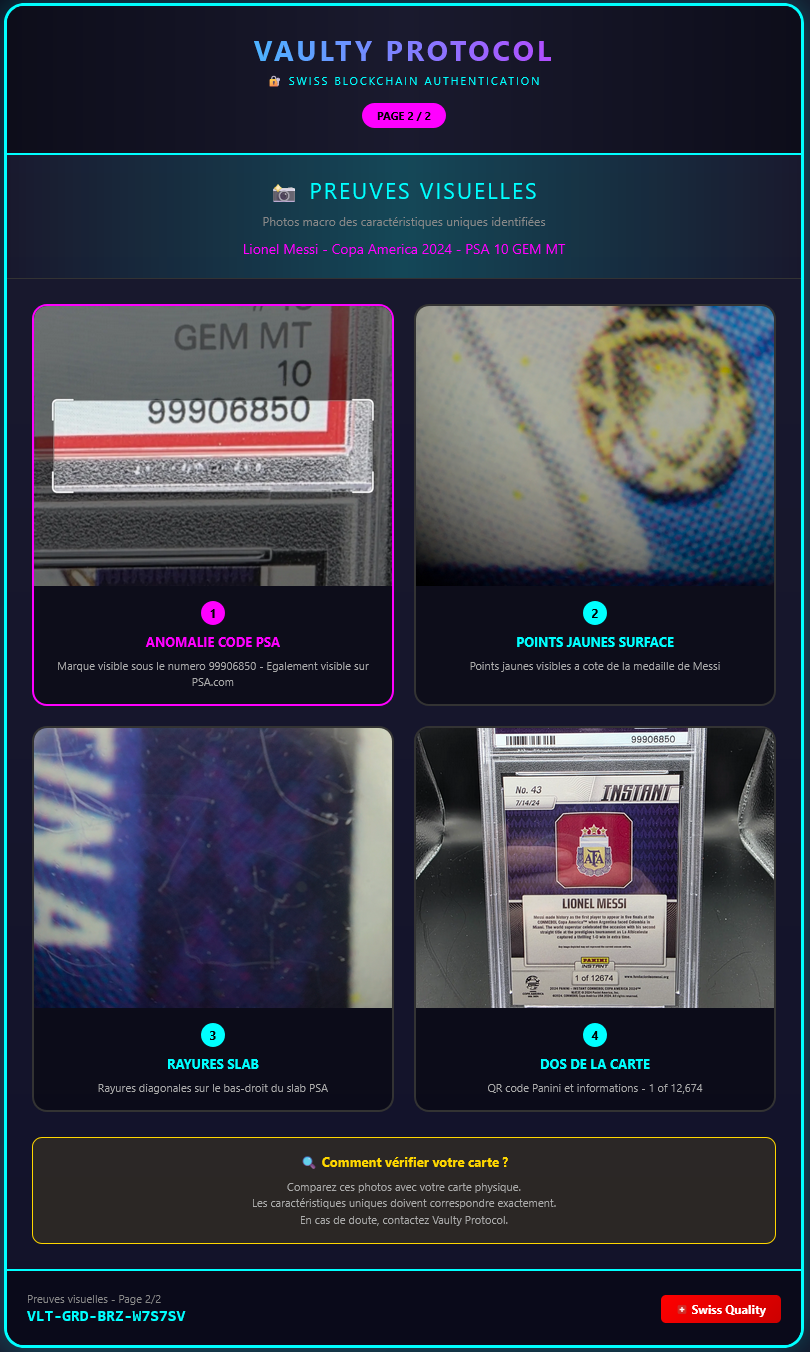 Grade parfait PSA 10. Authentifiée et certifiée par Vaulty Protocol avec empreinte digitale unique enregistrée sur blockchain.
