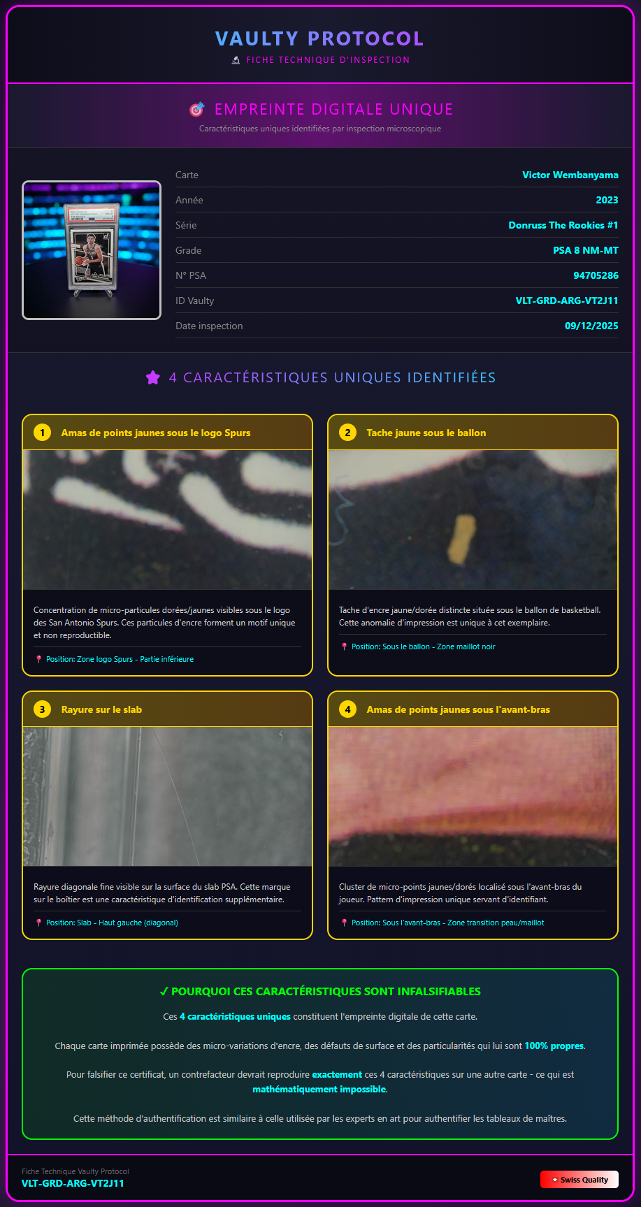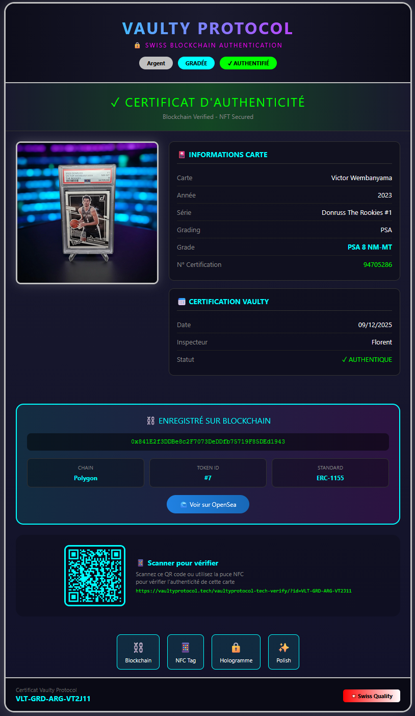 Expédition sécurisée depuis la Suisse avec tracking. La carte est livrée avec son certificat Vaulty officiel.